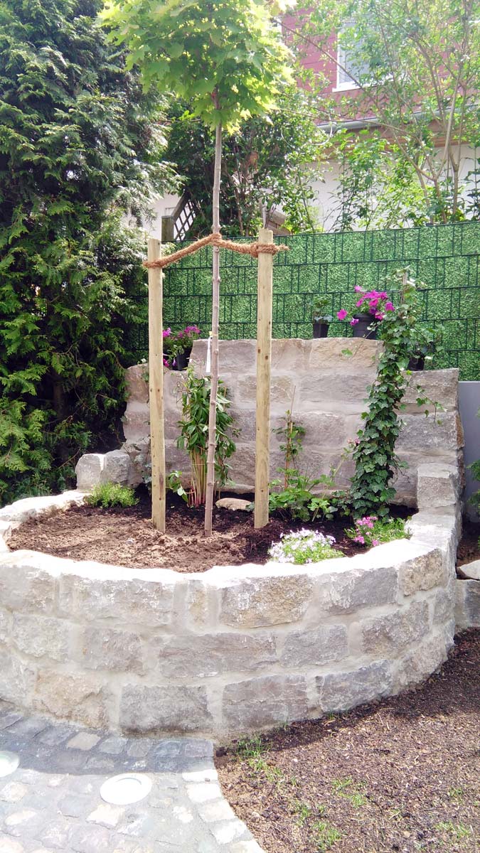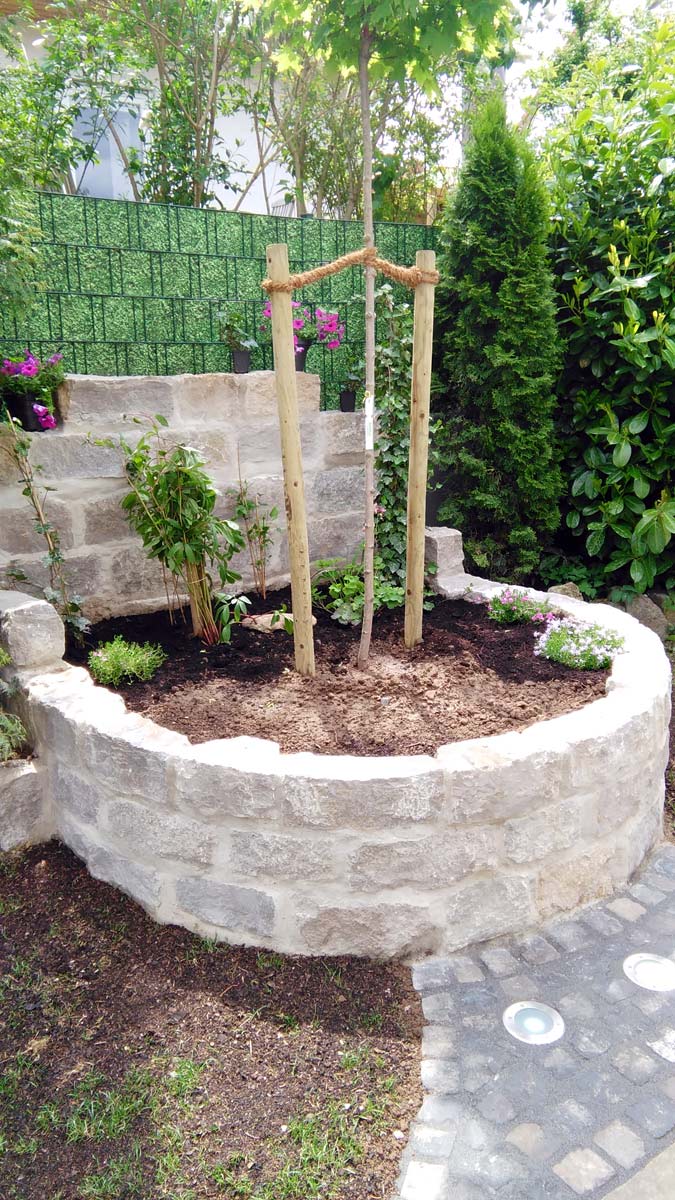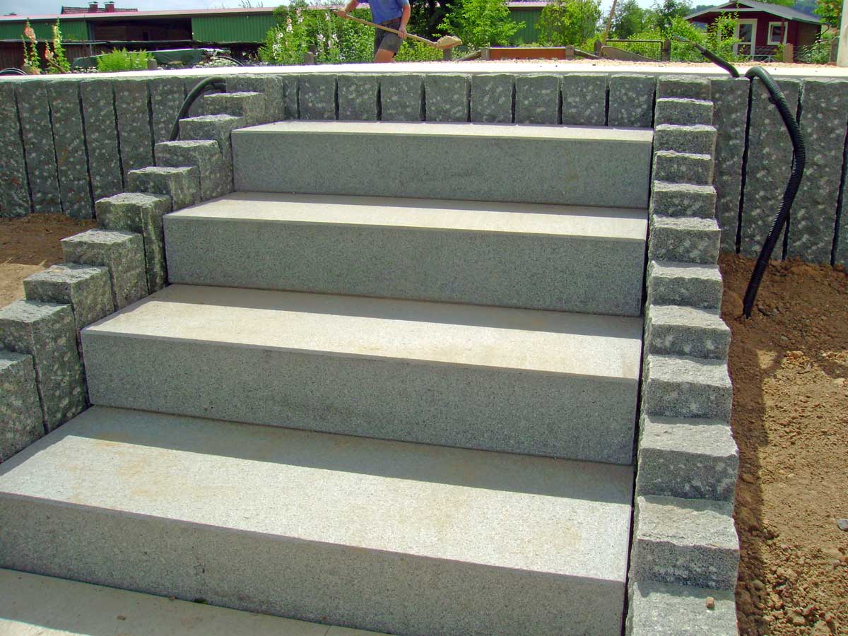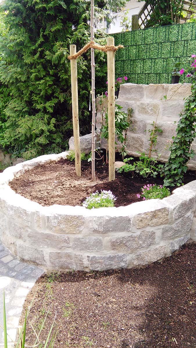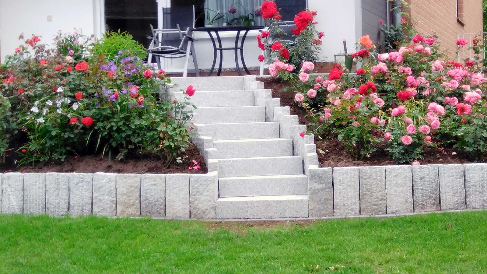 Zum Abfangen von größeren Geländeunterschieden: Palisaden und Winkelstützen. Als Material gibt es verschiedene Varianten von Natursteinen oder Stelen und Winkel aus Beton.