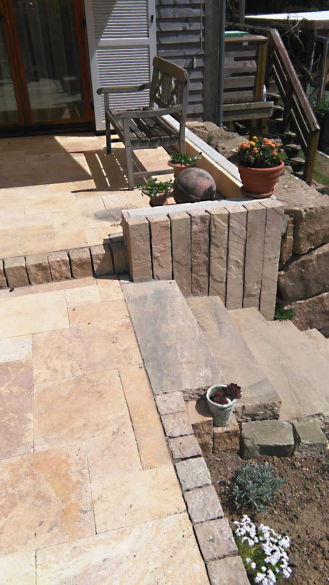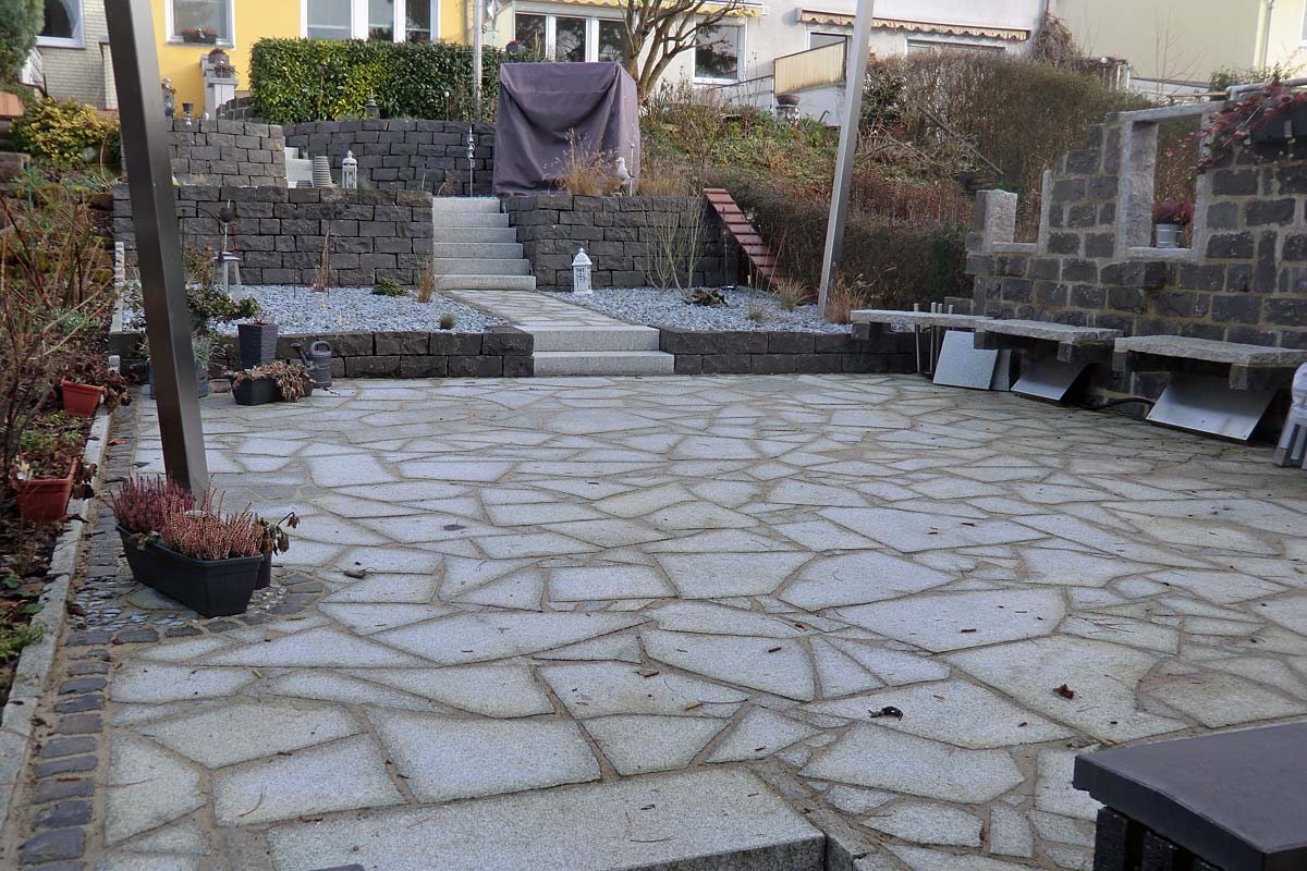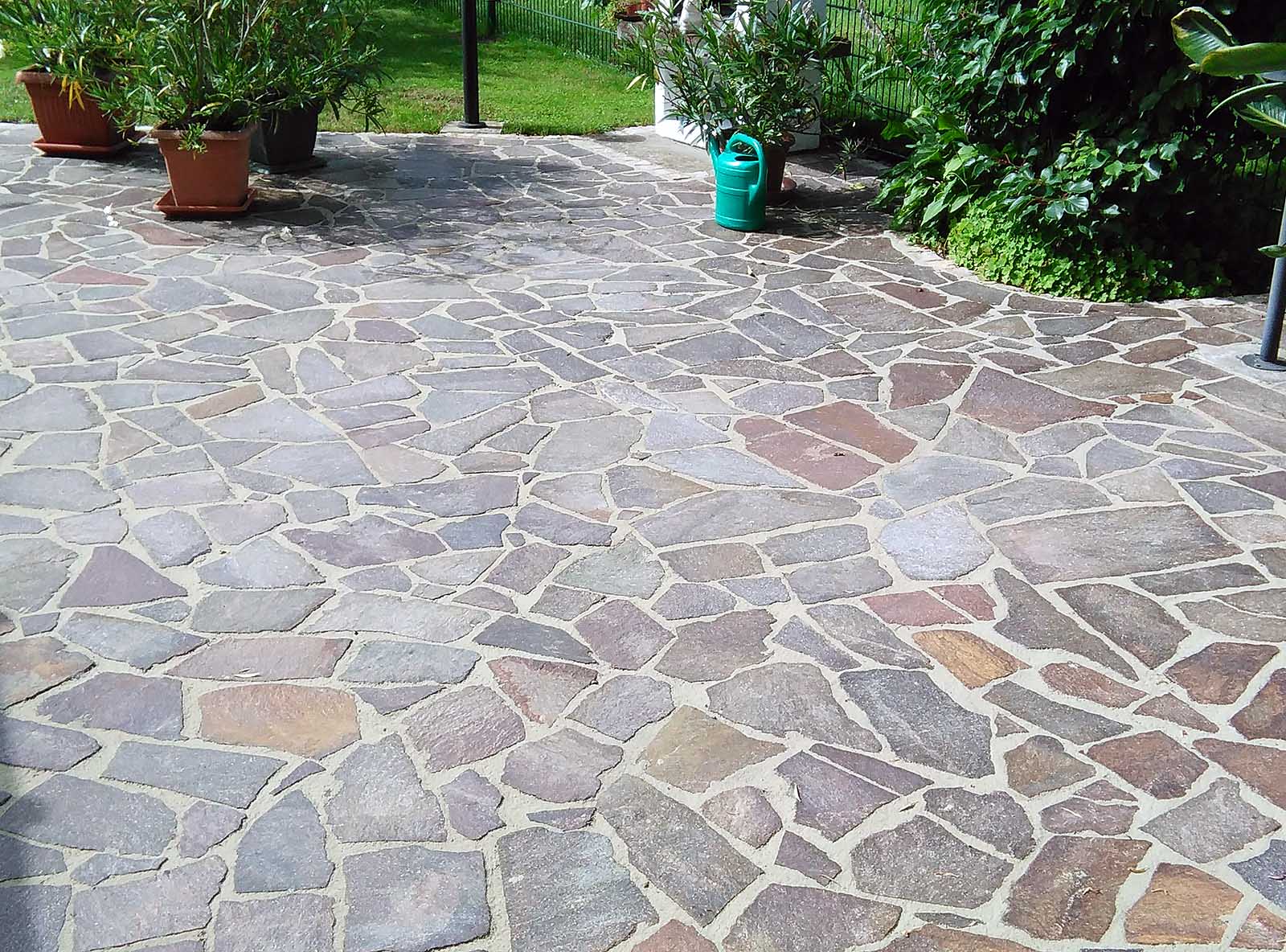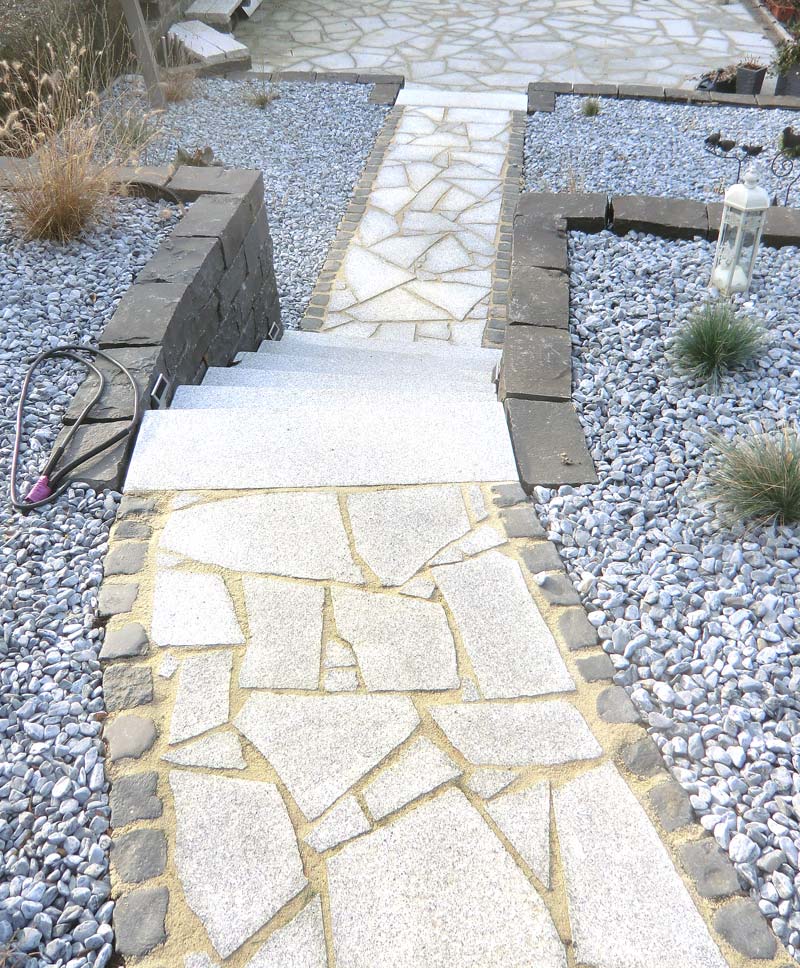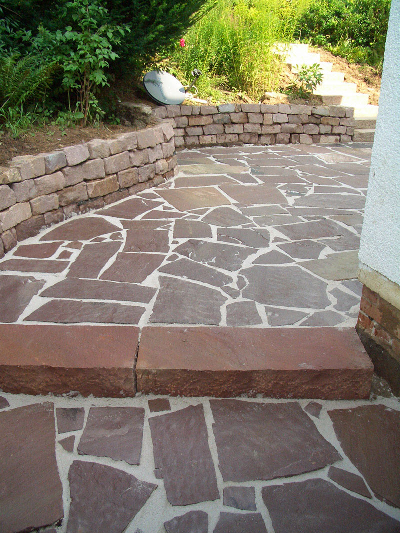 Naturnahe Gestaltung mit einem Moasik aus unregelmäßig geformten Platten aus verschiedenen Gesteinsarten, von hellem Quarzit über roten Sandstein bis zum dunklen Schiefer ist hier eine große Vielfalt möglich.
